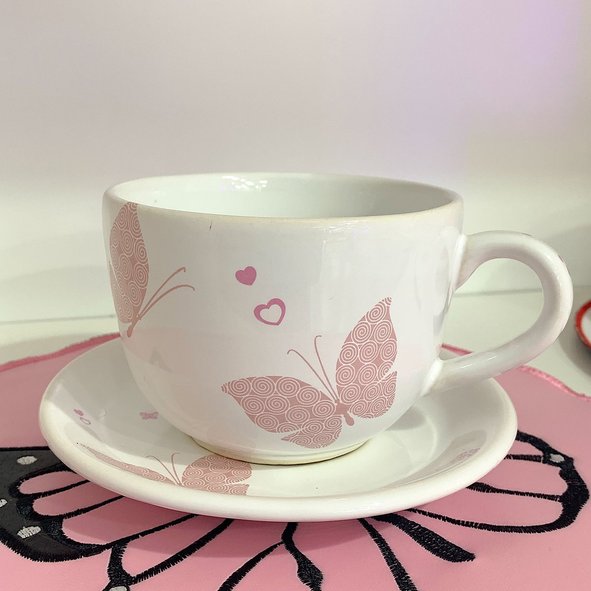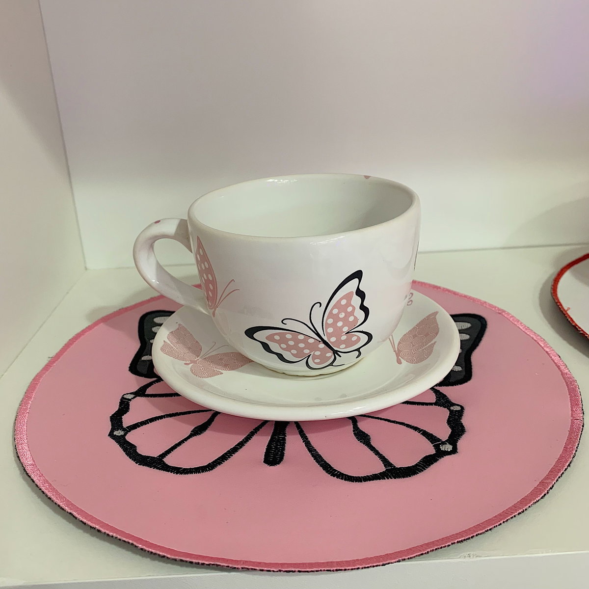 Set mariposa rosa: individual, taza y platito